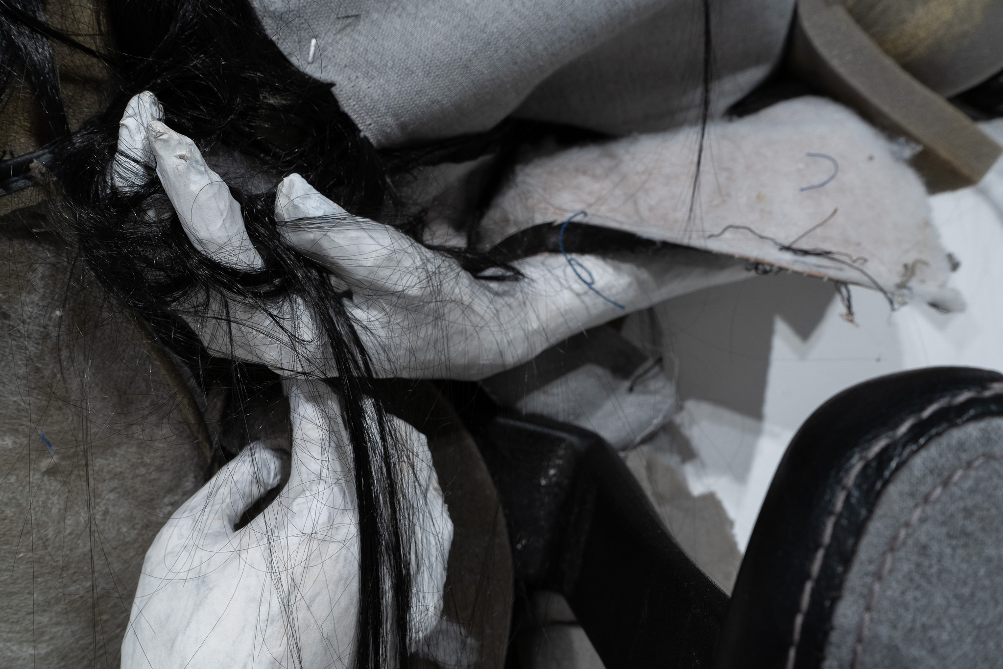 Found office chairs, chicken wire, paper-maché, gummy candy, hair